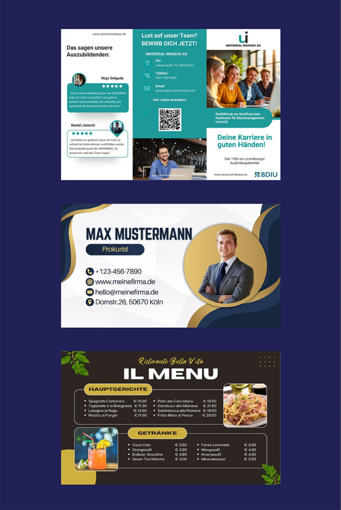 Gedruckte Kommunikation wirkt – wenn Gestaltung, Format und Inhalte perfekt zusammenspielen. Wir entwickeln hochwertige Printprodukte, die Ihre Botschaft klar transportieren und visuell überzeugen. Von der Idee bis zur druckfertigen Datei bekommen Sie bei uns alles aus einer Hand.